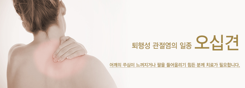 한방적으로는 오십견의 원인으로 한(寒)이나 습(濕), 담음(痰飮), 어혈(瘀血) 등의 나쁜 기운이 어깨 경락의 순환을 방해하여 발병하는 것으로 생각하고 있습니다. 어깨의 쑤심이 느껴지거나 팔을 들어올리기 힘든 분께 치료가 필요합니다.